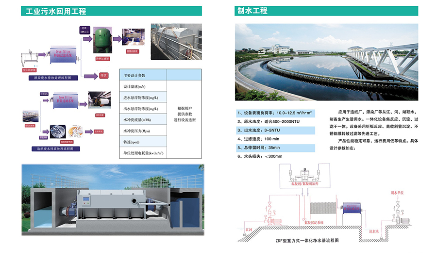 設(shè)備為連續(xù)過濾,當滾筒內(nèi)有水進入時,自控系統(tǒng)將啟動驅(qū)動系統(tǒng)驅(qū)動滾筒轉(zhuǎn)動,同時啟動反沖洗泵。滾筒開始緩慢轉(zhuǎn)動,反沖洗泵抽取濾后出水對濾網(wǎng)進行反沖洗。沖洗下來的顆粒物質(zhì)由設(shè)備內(nèi)部的反沖洗水收集槽收集,并通過排污管排出設(shè)備。反沖洗的同時,過濾正常運行。當無水通過設(shè)備時,設(shè)備將自動停止。